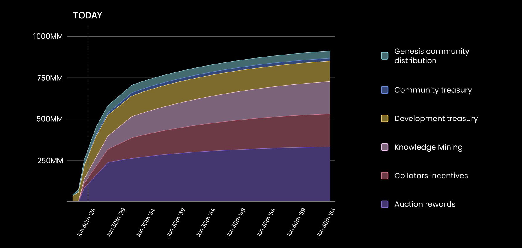 The total supply of NEURO that will ever be created is limited to 1,000,000,000 tokens. However, out of the maximum amount of tokens, only half was initially allocated, whilst the remaining half is minted through inflation in perpetuity, asymptotically reaching a 1,000,000,000 NEURO maximum supply.